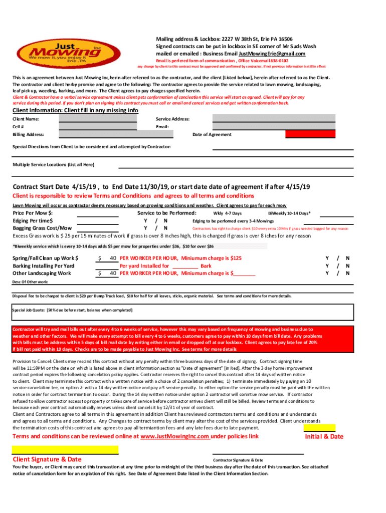 Mailing address & Lockbox: 2227 W 38th St, Erie PA 16506 Signed contracts can be put in lockbox in SE corner of Mr Suds Wash mailed or emailed : Business Email JustMowingErie@gmail.com Email is performed