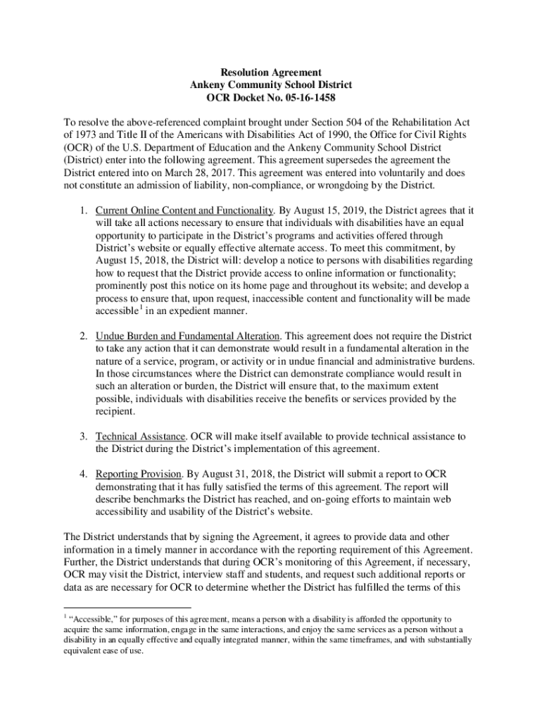 Resolution Agreement Ankeny Community School District OCR Docket No. 05161458 To resolve the above referenced complaint brought under Section 504 of the Rehabilitation Act of 1973 and Title II of