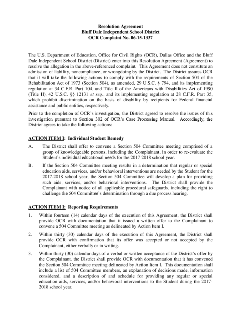 Resolution Agreement Bluff Dale Independent School District OCR Complaint No. 06151337The U.S. Department of Education, Office for Civil Rights (OCR), Dallas Office and the Bluff Dale Independent