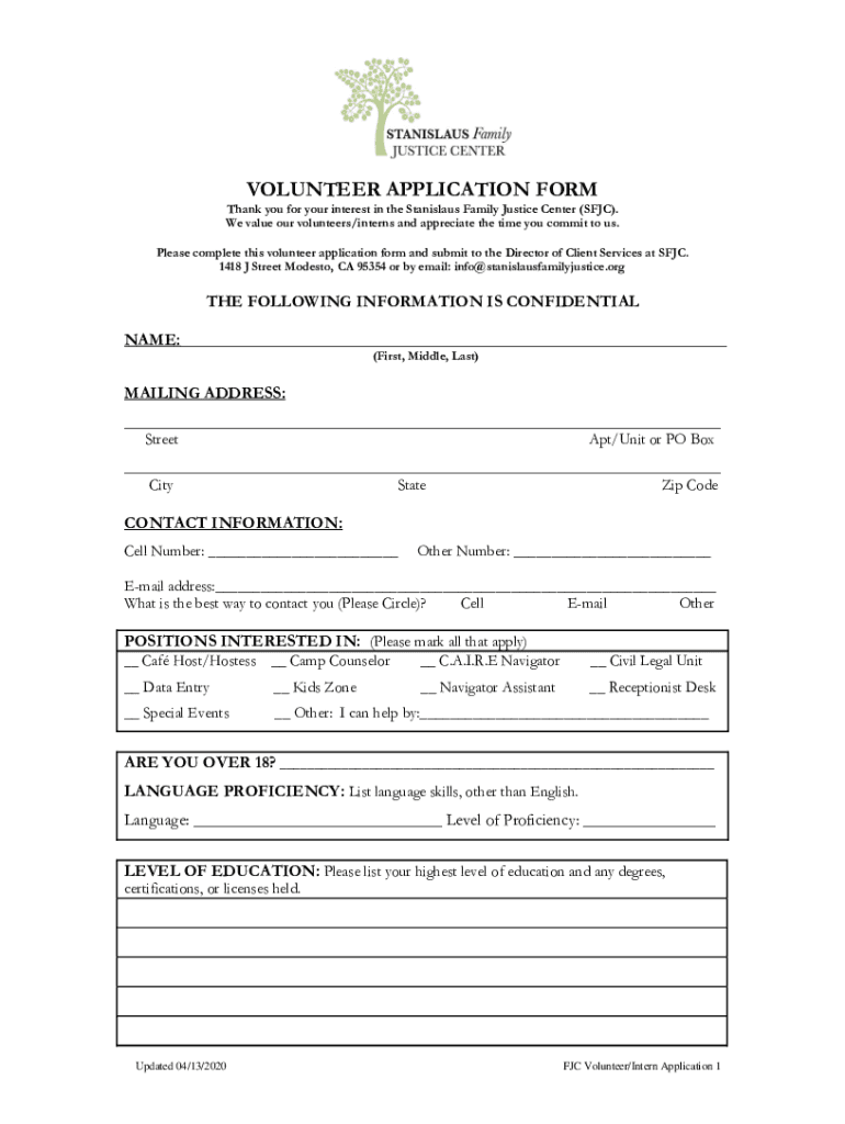 VOLUNTEER APPLICATION FORM Thank you for your interest in the Stanislaus Family Justice Center (SFC). We value our volunteers/interns and appreciate the time you commit to us. Please complete this