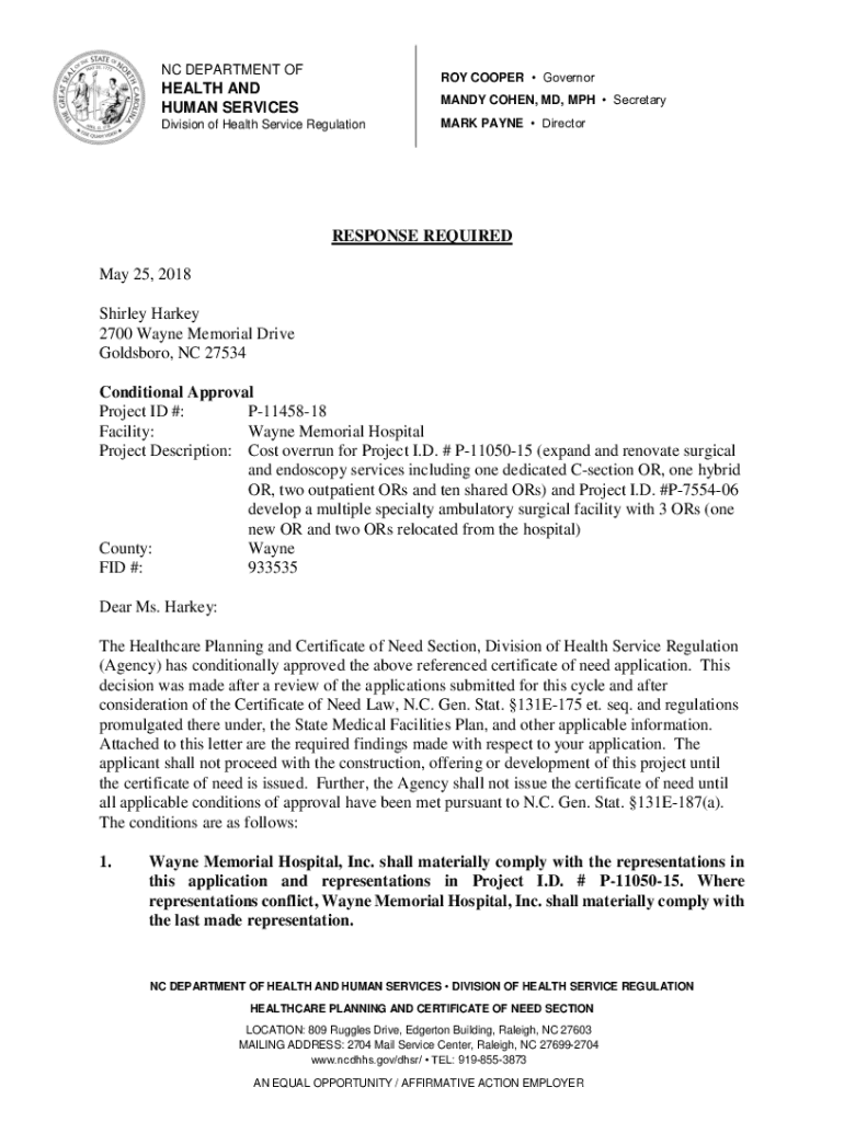 NC DEPARTMENT FROM COOPER GovernorHEALTH AND HUMAN SERVICEMAN COHEN, MD, MPH SecretaryDivision of Health Service RegulationMARK PAYNE DirectorRESPONSE REQUIRED May 25, 2018, Shirley Harvey 2700 Wayne