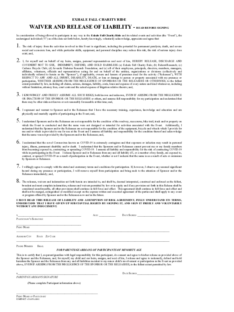 Get the free EXHALE FALL CHARITY RIDE WAIVER AND RELEASE OF LIABILITY - READ BEFORE ...