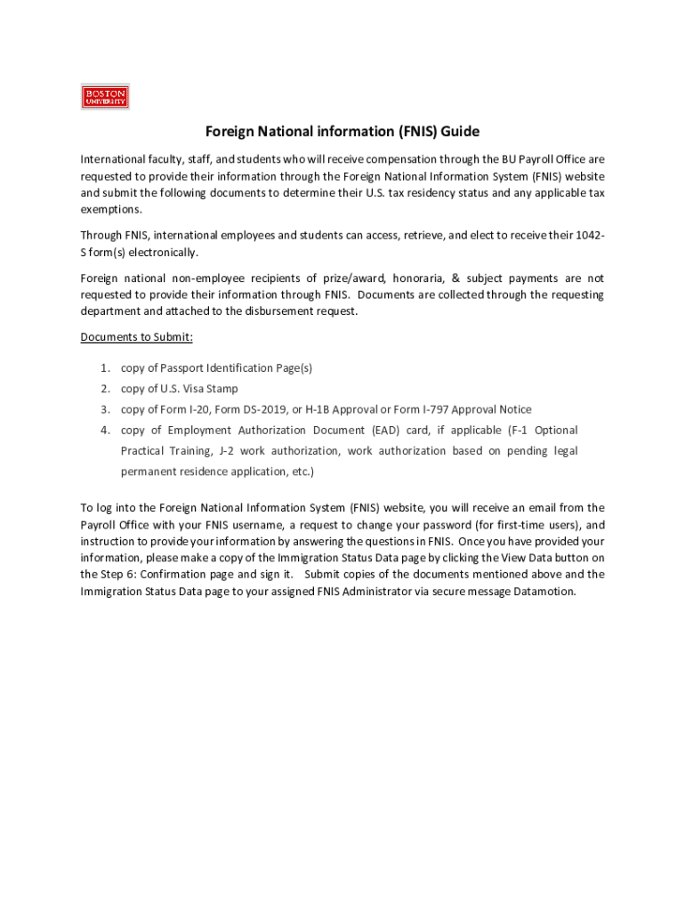 Foreign National information (FINIS) Guide International faculty, staff, and students who will receive compensation through the BU Payroll Office are requested to provide their information through