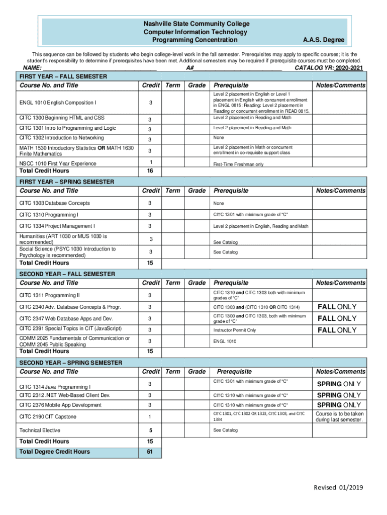 Nashville State Community College Computer Information Technology Programming Concentration. A.S. Degrees sequence can be followed by students who begin college level work in the fall semester. Prerequisites