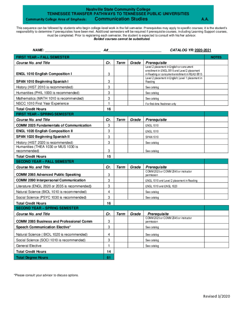 Nashville State Community College TENNESSEE TRANSFER PATHWAYS TO TENNESSEE PUBLIC UNIVERSITIES Community College Area of Emphasis: Communication Studies Degree. A. This sequence can be followed by