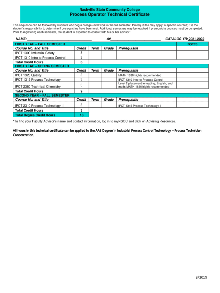 Nashville State Community CollegeProcess Operator Technical Certificate This sequence can be followed by students who begin college level work in the fall semester. Prerequisites may apply to specific