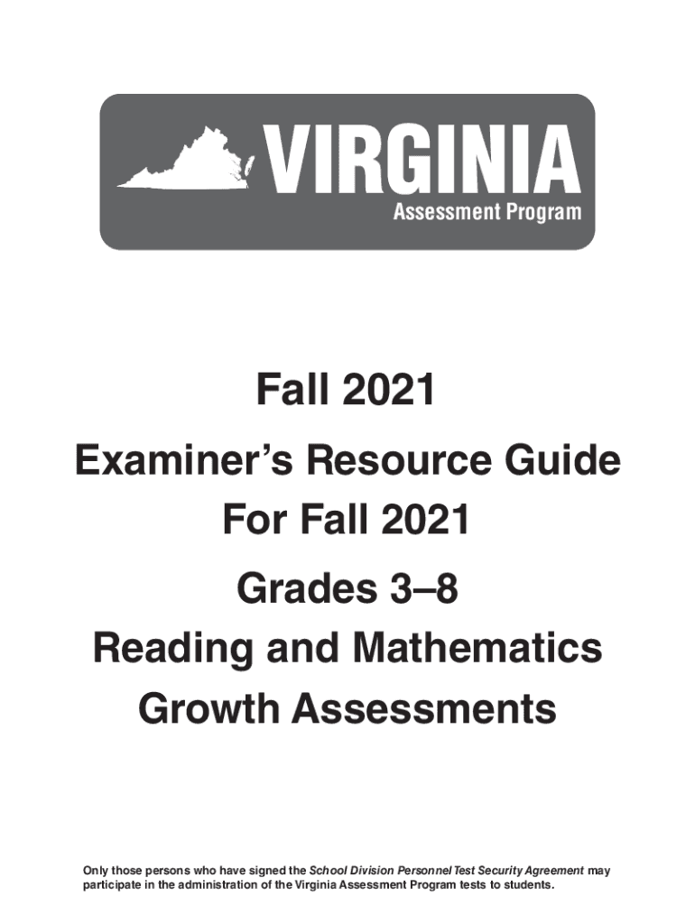 VIRGINIAAssessment Programmable 2021 Examiners Resource Guide For Fall 2021 Grades 38 Reading and Mathematics Growth AssessmentsOnly those persons who have signed the School Division Personnel Test