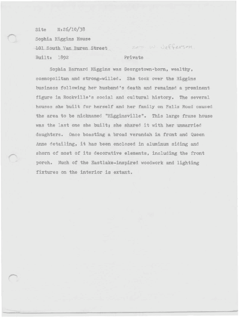 Get the free Site M126/10/J8 Sophia Higgins House lOLSouth Van Buren Street ... - mht maryland