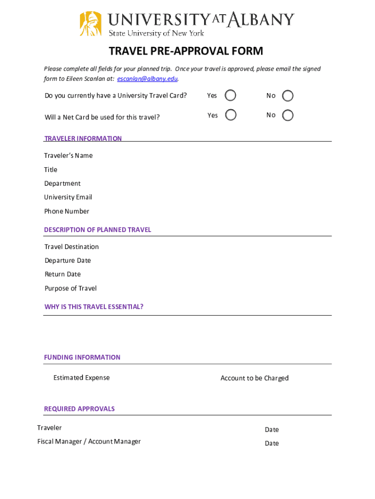 TRAVEL PREAPPROVAL FORM Please complete all fields for your planned trip. Once your travel is approved, please email the signed form to Eileen Scandal at: escanlan@albany.edu. Do you currently have