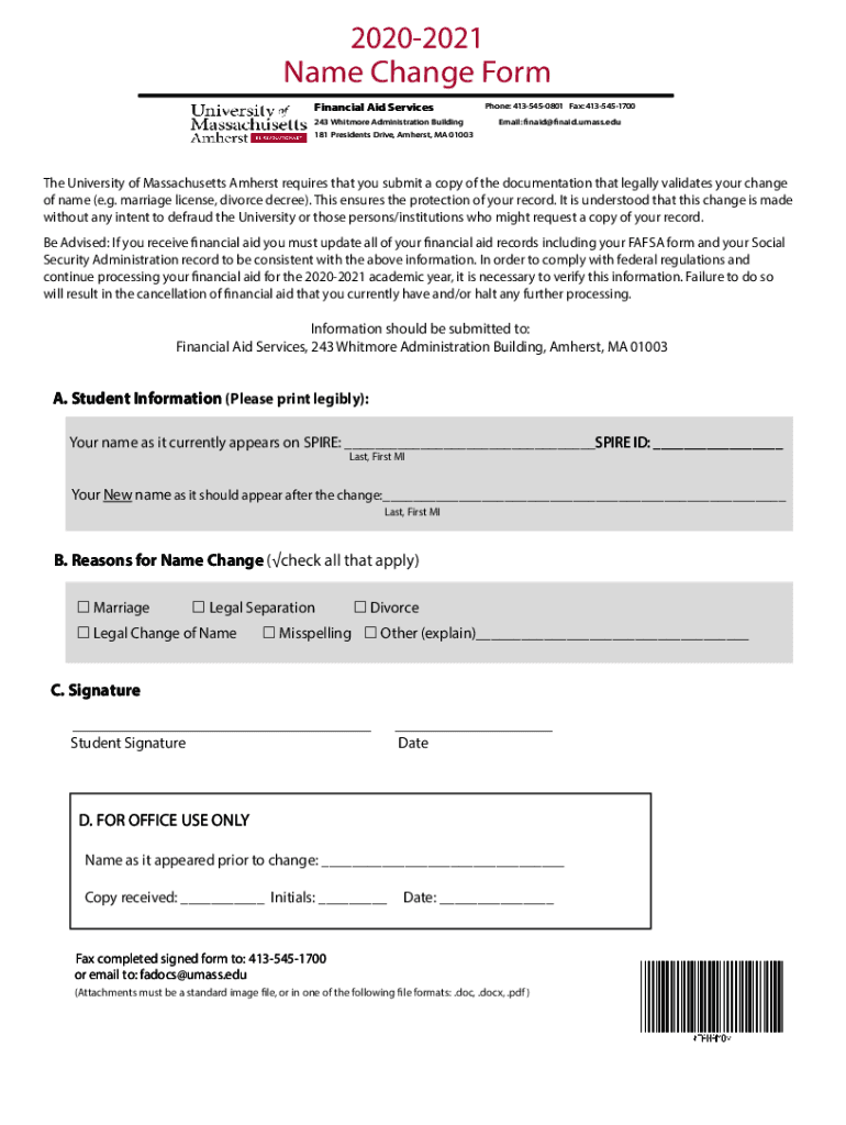 20202021 Name Change Form Financial Aid Services 243 Whitmore Administration BuildingPhone: 4135450801 Fax: 4135451700Email: finaid@finaid.umass.edu181 Presidents Drive, Amherst, MA 01003The University