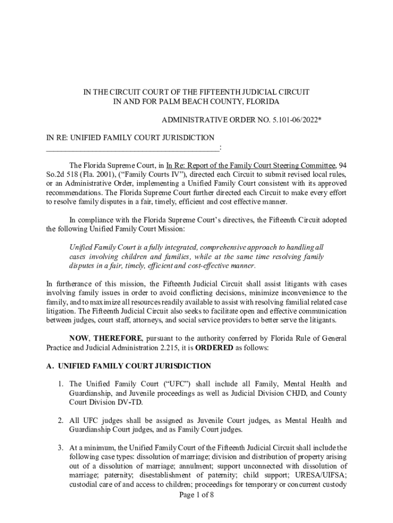 IN THE CIRCUIT COURT OF THE FIFTEENTH JUDICIAL CIRCUIT IN AND FOR PALM BEACH COUNTY, FLORIDA ADMINISTRATIVE ORDER NO. 5.10106/2022* IN RE: UNIFIED FAMILY COURT JURISDICTION ___: The Florida Supreme