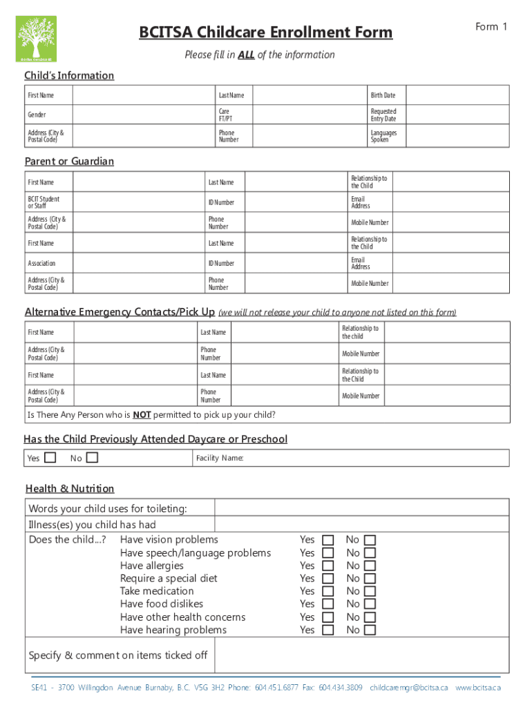 Form 1BCITSA Childcare Enrollment Form
