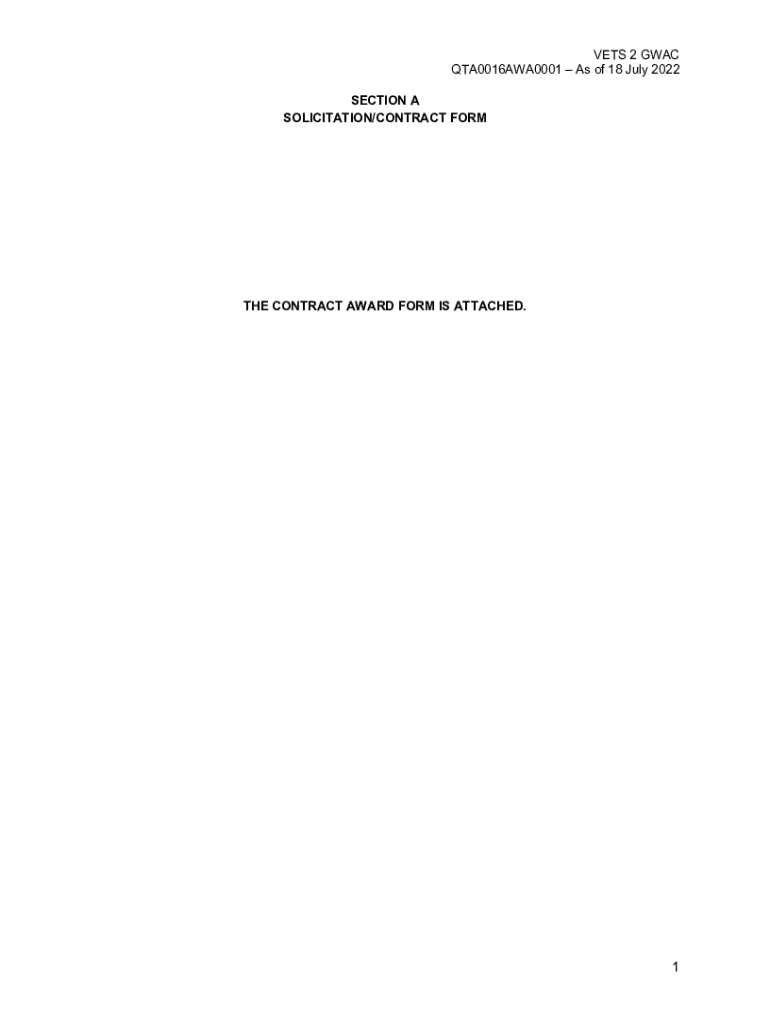 VETS 2 WAC QTA0016AWA0001 As of 18 July 2022 SECTION A SOLICITATION/CONTRACT FORTH CONTRACT AWARD FORM IS ATTACHED.1VETS 2 WAC QTA0016AWA0001 As of 18 July 2022 SECTION B SUPPLIES OR SERVICES AND