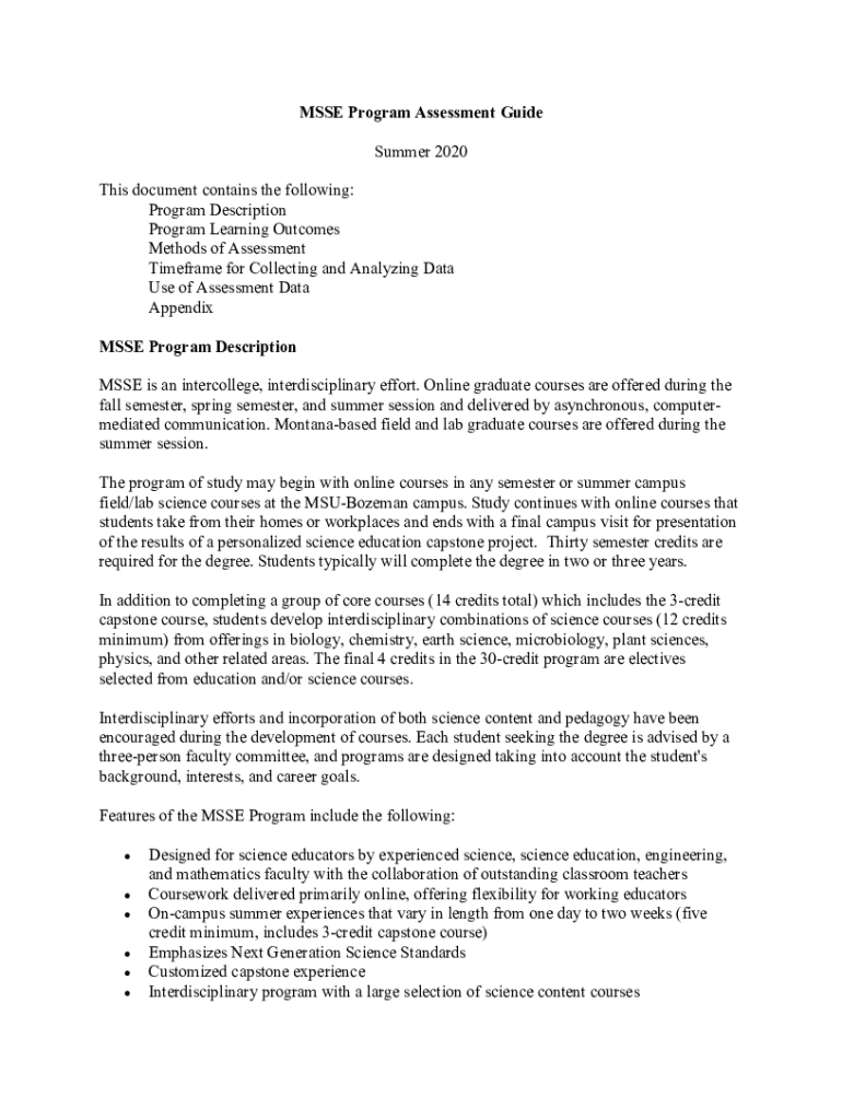 MUSE Program Assessment Guide Summer 2020 This document contains the following: Program Description Program Learning Outcomes Methods of Assessment Timeframe for Collecting and Analyzing Data Use