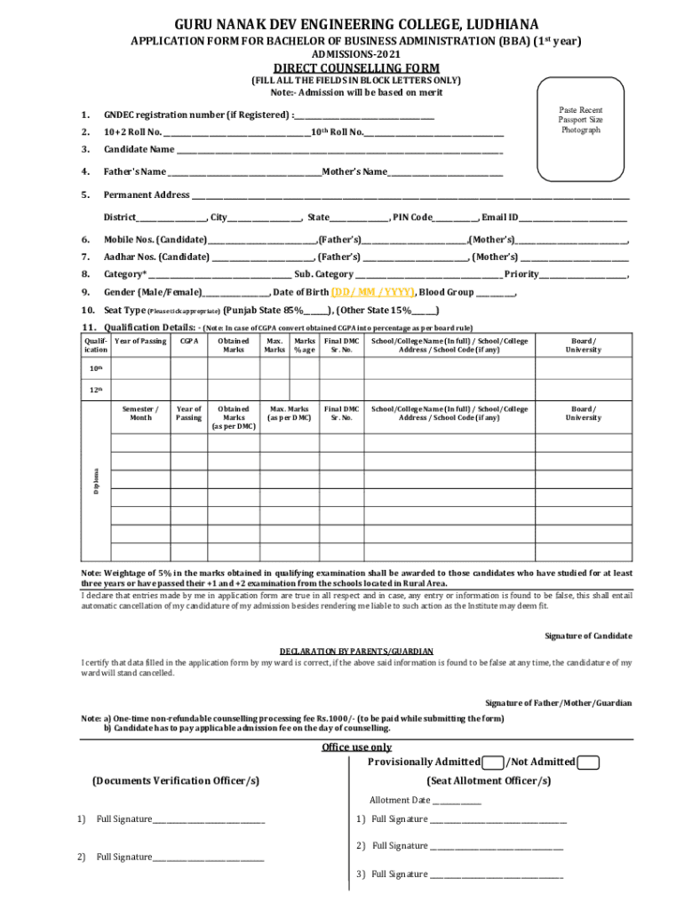 GURU NANAK DEV ENGINEERING COLLEGE, LUDHIANA APPLICATION FORM FOR BACHELOR OF BUSINESS ADMINISTRATION (BBA) (1st year) ADMISSIONS2021DIRECT COUNSELLING FORM (FILL ALL THE FIELDS IN BLOCK LETTERS ONLY)