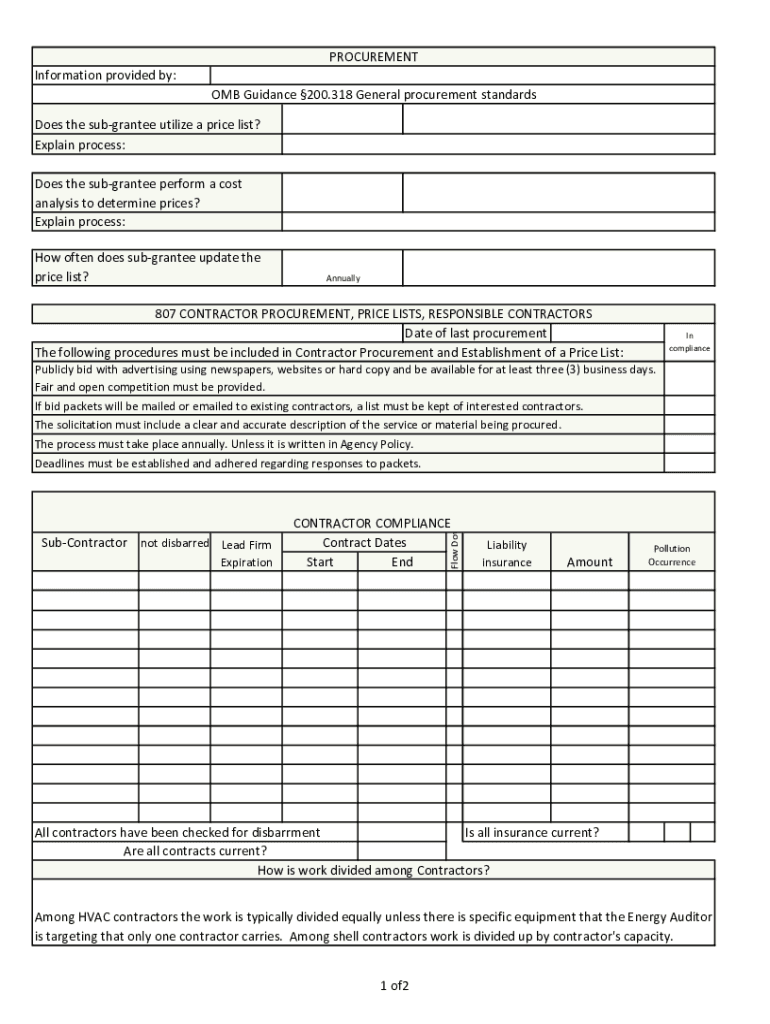 Information provided by:PROCUREMENT OMB Guidance 200.318 General procurement standards If no, Subgrantee must demonstrate that prices paid for both labor and materials are reasonable based upon market