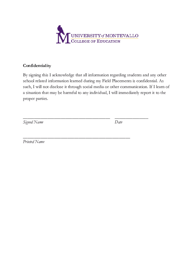 Confidentiality By signing this I acknowledge that all information regarding students and any other school related information learned during my Field Placements is confidential. As such, I will not