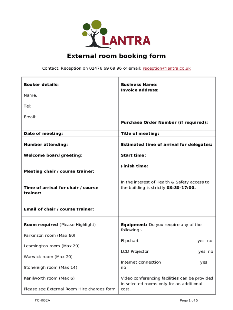 The EXTERNAL ROOM BOOKING is a Word document you can get completed and signed for certain purpose. In that case, it is furnished to the exact addressee in order to provide certain details of any kinds. The completion and signing is possible manually in hard copy or with a suitable service e. g. PDFfiller. Such services help to fill out any PDF or Word file without printing out. It also lets you customize its appearance according to the needs you have and put an official legal electronic signature. Once finished, you send the EXTERNAL ROOM BOOKING to the respective recipient or several recipients by mail or fax. PDFfiller has got a feature and options that make your blank printable. It provides different settings for printing out appearance. It does no matter how you distribute a document - physically or by email - it will always look neat and firm. In order not to create a new document from scratch all the time, turn the original form into a template. Later, you will have a rewritable sample.