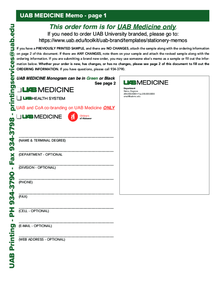 UAB Printing PH 9343790 Fax 9343798 printingservices@uab.eduUAB MEDICINE Memo page 1This order form is for UAB Medicine only. If you need to order UAB University branded, please go to: https://www.uab.edu/toolkit/uabbrand/templates/stationerymemosIf