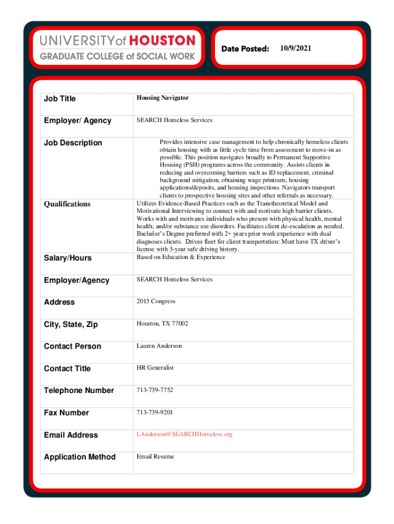 10/9/2021Job TitleHousing NavigatorEmployer/ AgencySEARCH Homeless Services Job DescriptionSalary/HoursProvides intensive case management to help chronically homeless clients obtain housing with as