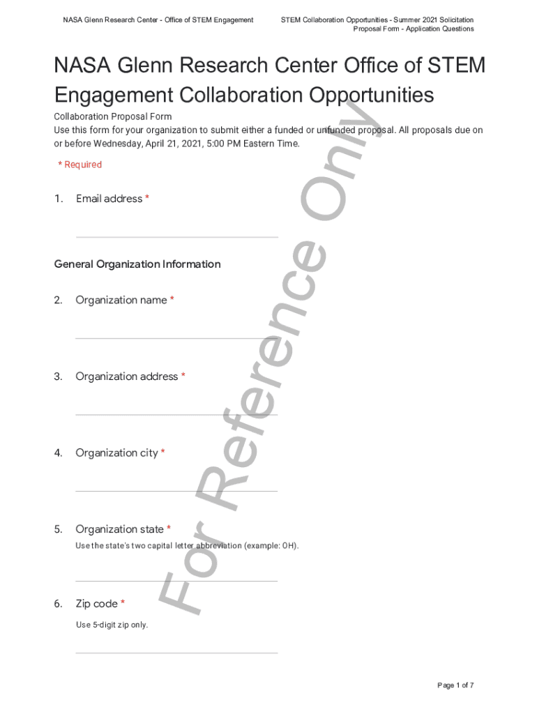 NASA Glenn Research Center Office of STEM Engagement STEM Collaboration Opportunities Summer 2021 Solicitation Proposal Form Application QuestionsnlyNASA Glenn Research Center Office of STEM Engagement