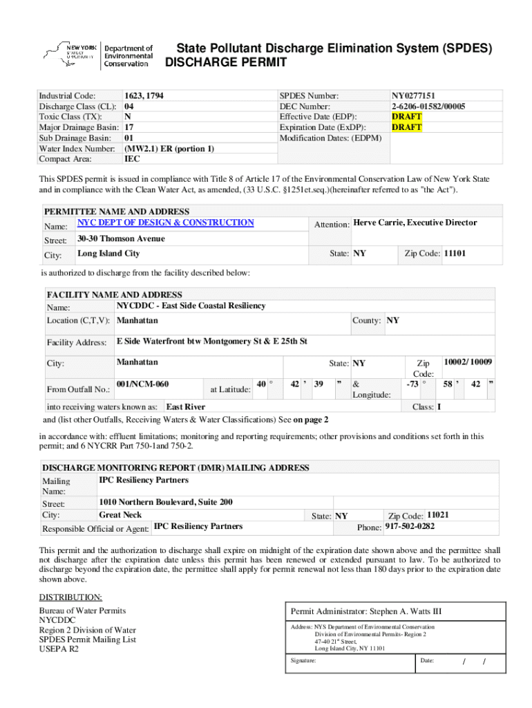 Get the free State Pollutant Discharge Elimination System (SPDES) DISCHARGE PERMIT