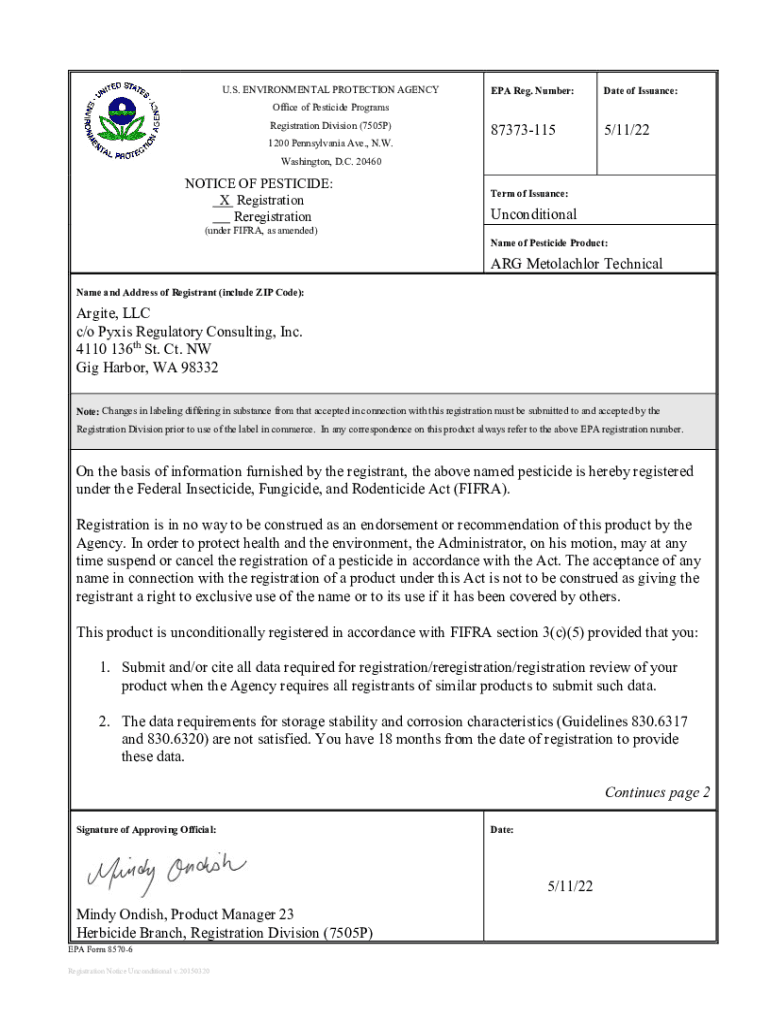U.S. ENVIRONMENTAL PROTECTION AGENCY EPA Reg. Number:Date of Issuance:873731155/11/22Office of Pesticide Programs