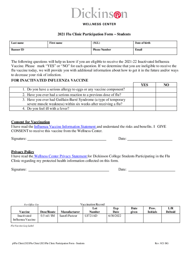 Get the free 2021 Flu Clinic Participation Form - Dickinson College