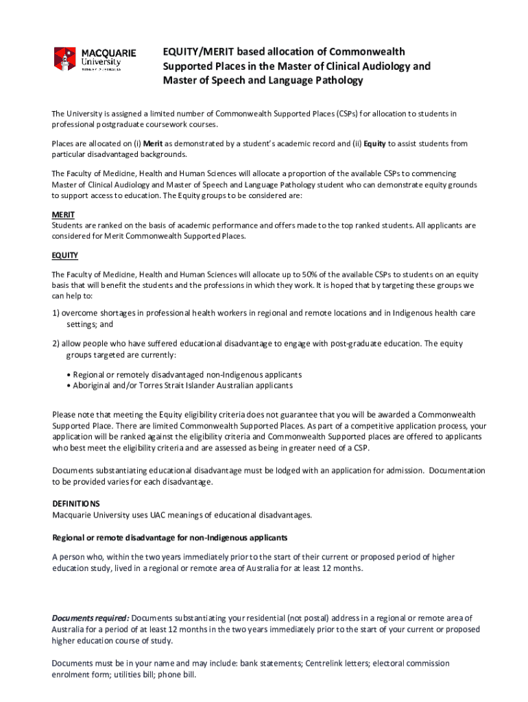 EQUITY/MERIT based allocation of Commonwealth Supported Places in the D DOW The University is assigned a limited number of Commonwealth Supported Places (CSPS) for allocation to students in professional
