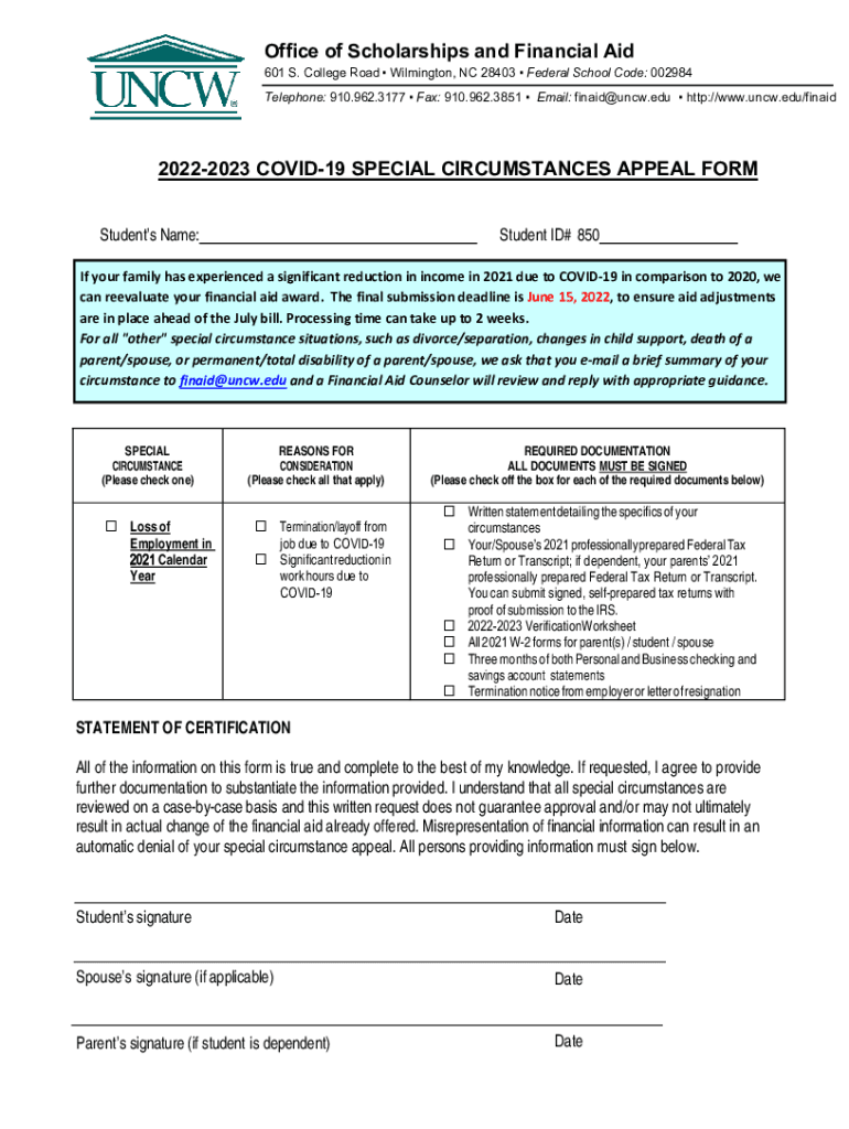 Office of Scholarships and Financial Aid601 S. College Road Wilmington, NC 28403 Federal School Code: 002984Telephone: 910.962.3177 Fax: 910.962.3851 Email: finaid@uncw.edu http://www.uncw.edu/finaid20222023