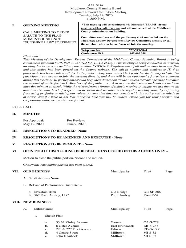 AGENDA Middlesex County Planning Board Development Review Committee Meeting Tuesday, July 14, 2020, at 3:00 P.M. I.×This meeting will be conducted via Microsoft TEAMS virtual meeting with a calling