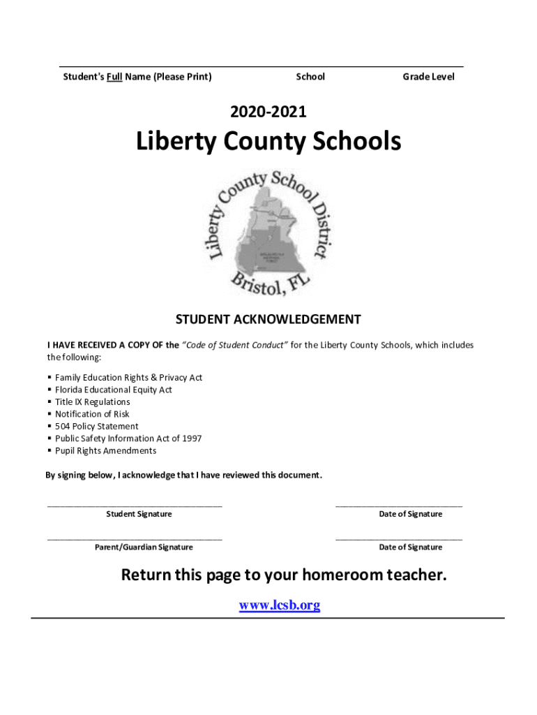 Student\'s Full Name (Please Print)Schoolmate Level20202021Liberty County SchoolsSTUDENT ACKNOWLEDGEMENT