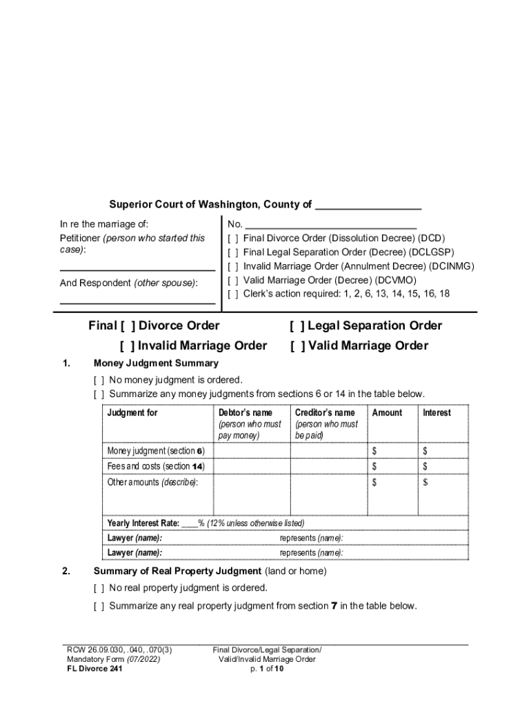 Superior Court of Washington, County of In re the marriage of: Petitioner (person who started this case):No. [ ] Final Divorce Order (Dissolution Decree) (DCD) [ ] Final Legal Separation Order (Decree)