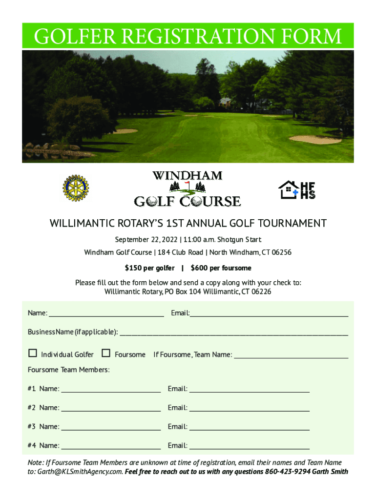 GOLFER REGISTRATION FORMWILLIMANTIC ROTARY 1ST ANNUAL GOLF TOURNAMENT September 22, 2022 | 11:00 a.m. Shotgun Start Wind ham Golf Course | 184 Club Road | North Wind ham, CT $06256150 per golfer|$600