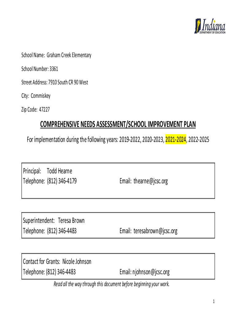 School Name: Graham Creek Elementary School Number: 3361 Street Address: 7910 South CR 90 West City: Commissary Zip Code: 47227COMPREHENSIVE NEEDS ASSESSMENT/SCHOOL IMPROVEMENT PLAN For implementation