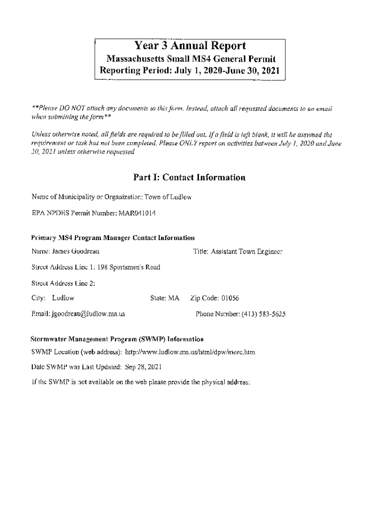 Year 3 Annual Report Massachusetts Small MS4 General Permit Reporting Period: July 1, 2020June 30, 2021**Please DO NOT attach any documents to this.form. Instead, attach all requested documents to