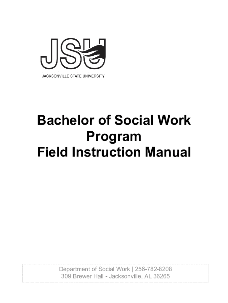 Bachelor of Social Work Program Field Instruction ManualDepartment of Social Work | 2567828208 309 Brewer Hall Jacksonville, AL 36265Field Student Placement Manual Revised August 2021 Jacksonville