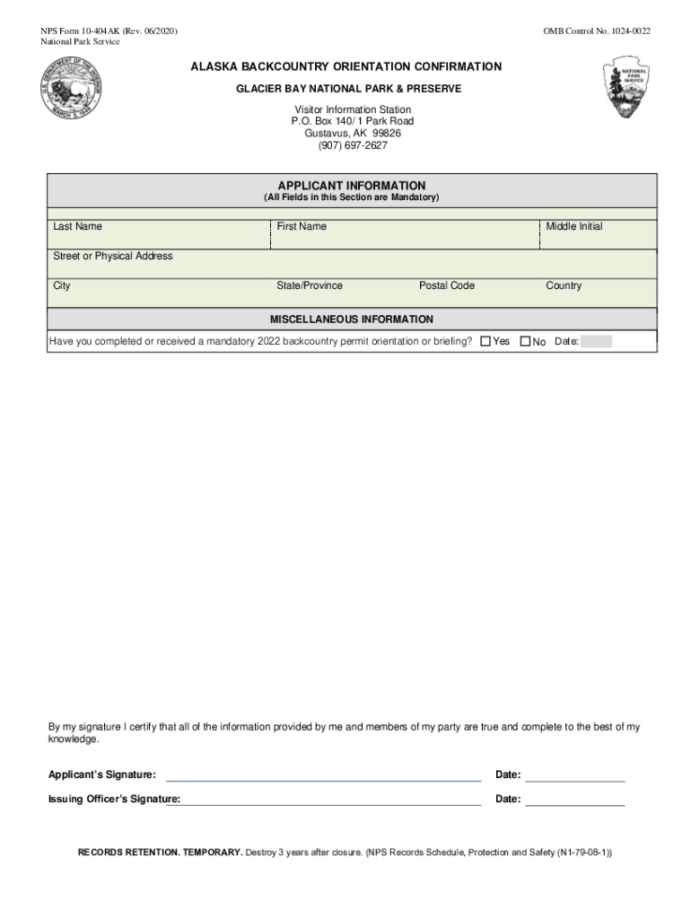 ALASKA BACKCOUNTRY ORIENTATION CONFIRMATION GLACIER BAY NATIONAL PARK & PRESERVE Visitor Information Station P.O. Box 140/ 1 Park Road Gustavus, AK 99826 (907) 6972627I certify that I have completed