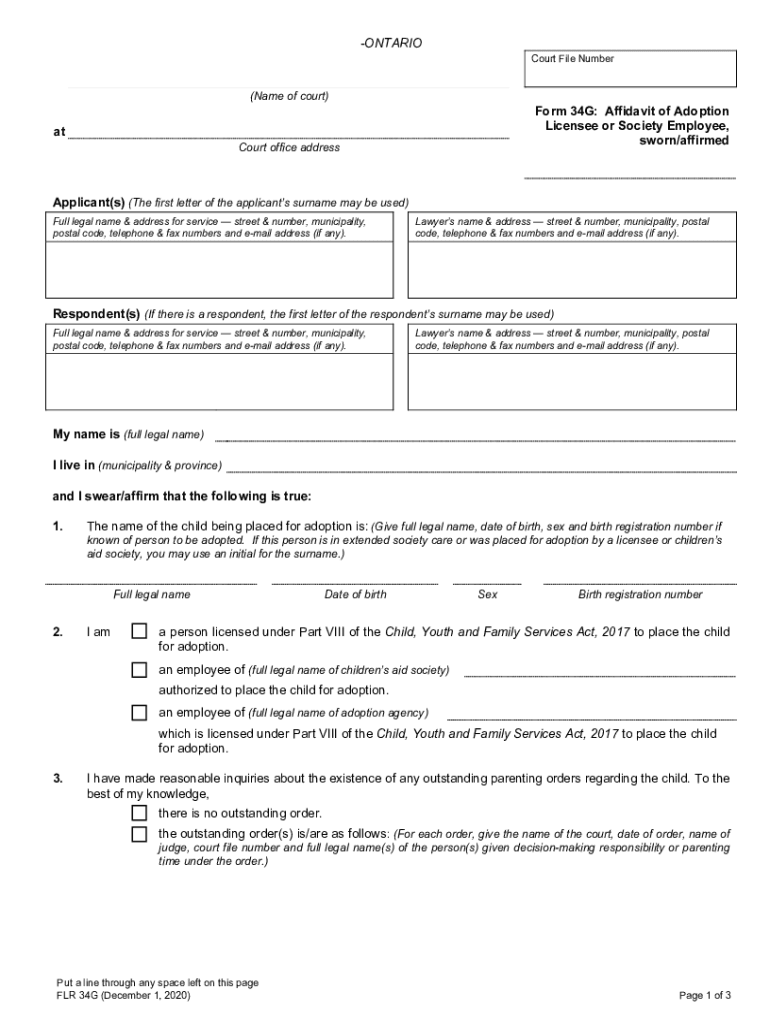 ONTARIOCourt File Number(Name of court)form 34G: Affidavit of Adoption Licensee or Society Employee, sworn/affirmedCourt office addressApplicant(s) (The first letter of the applicants surname may