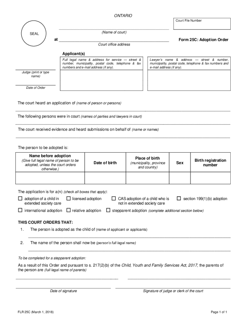 ONTARIO Court File Number(Name of court)Deplatform 25C: Adoption Order Court office addressApplicant(s) Full legal name & address for service street & number, municipality, postal code, telephone