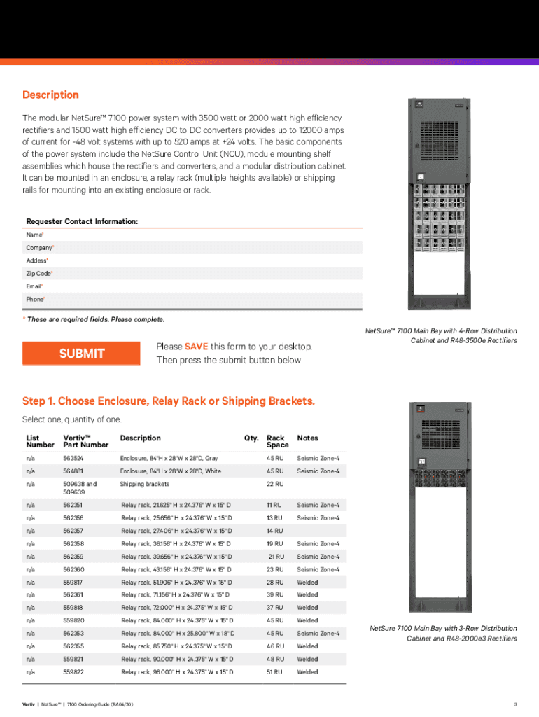 Netsuke 7100 Ordering Guide 48V DC Power System 582127000 (200 A to 12,000 A)Netsuke 7100 Ordering Suitable of Contents Step 1. Choose Enclosure, Relay Rack or Shipping Brackets. . . . . . . . . .