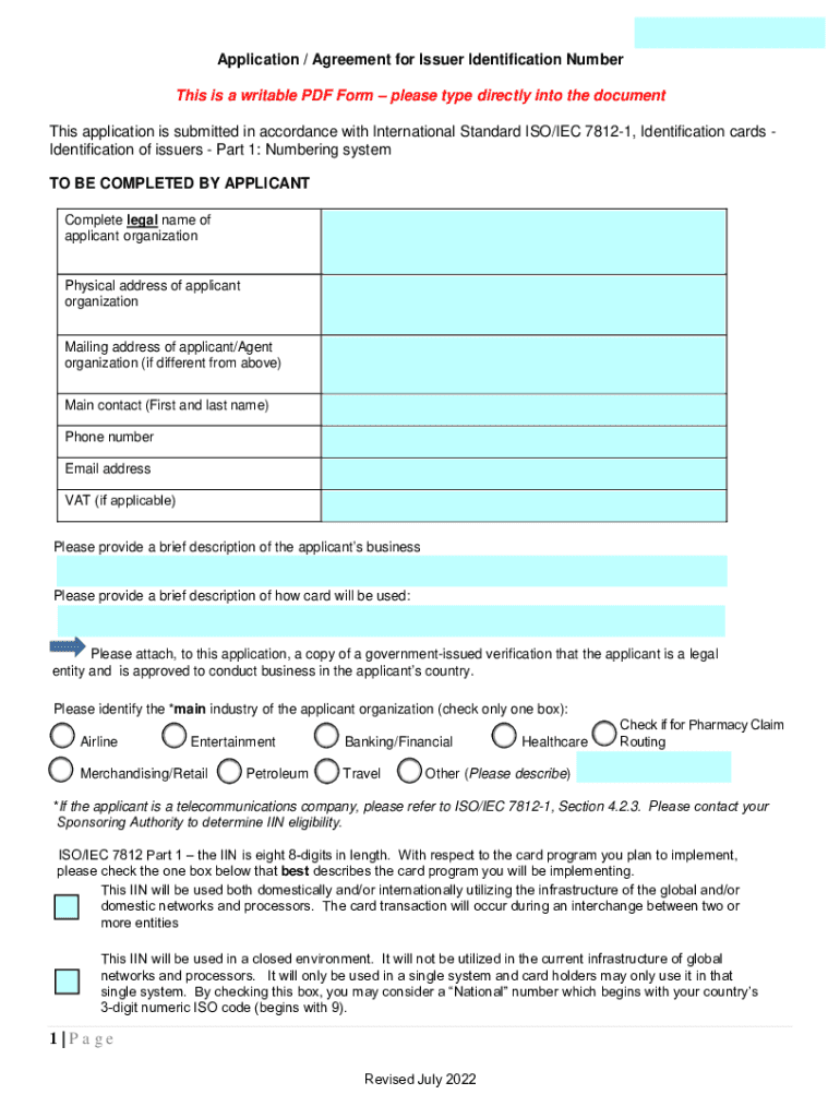 Application / Agreement for Issuer Identification Number This is a writable PDF Form please type directly into the document This application is submitted in accordance with International Standard