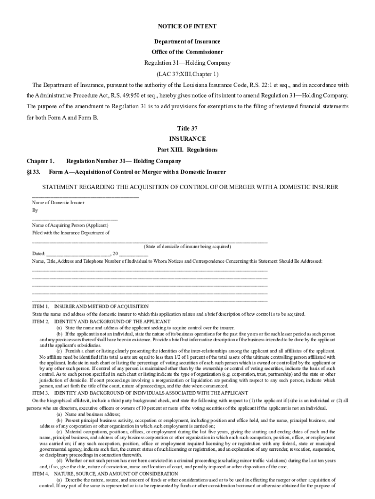 NOTICE OF INTENT Department of Insurance Office of the Commissioner Regulation 31Holding Company (LAC 37:XIII. Chapter 1) The Department of Insurance, pursuant to the authority of the Louisiana Insurance