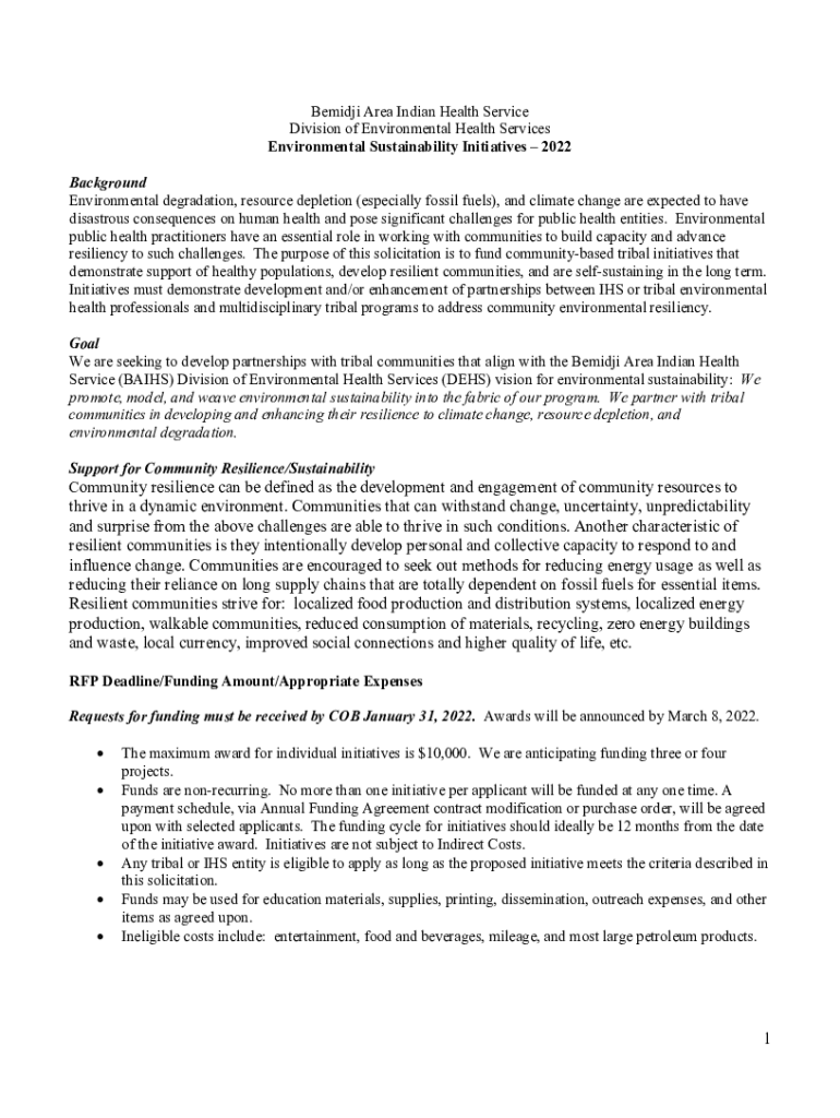 Beside Area Indian Health Service Division of Environmental Health Services Environmental Sustainability Initiatives 2022 Background Environmental degradation, resource depletion (especially fossil