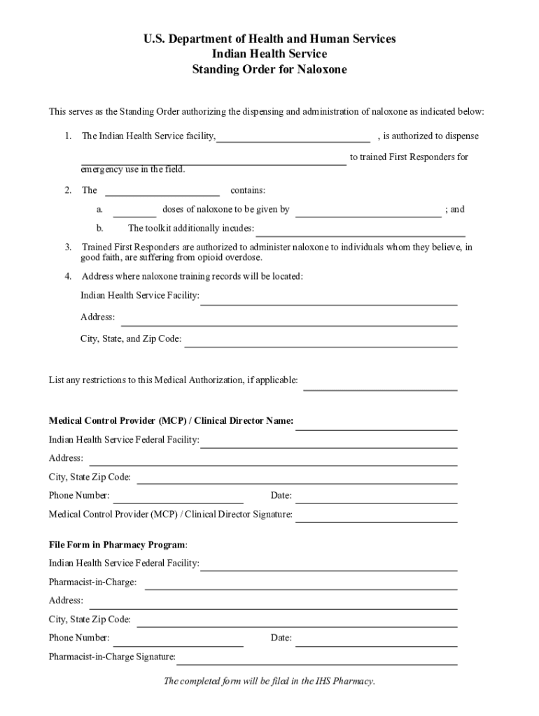 U.S. Department of Health and Human Services Indian Health Service Standing Order for Naloxone This serves as the Standing Order authorizing the dispensing and administration of naloxone as indicated