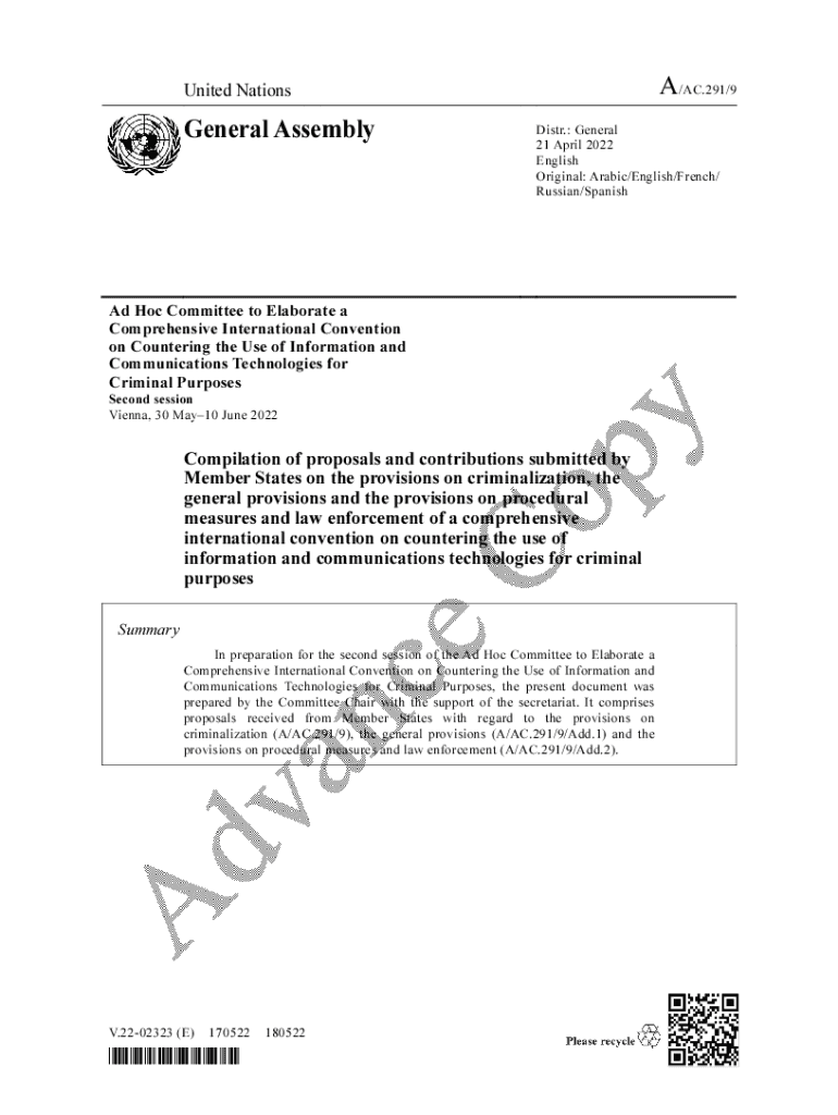 A/AC.291/9United NationsGeneral AssemblyDistr.: General 21 April 2022 English Original: Arabic/English/French/ Russian/Spanish Hoc Committee to Elaborate a Comprehensive International Convention on