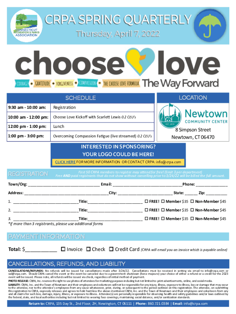 Thursday, April 7, 2022SCHEDULE 9:30 am 10:00 am:LOCATIONRegistration10:00 am 12:00 pm: Choose Love Kickoff with Scarlett Lewis 0.2 Zeus 12:00 pm 1:00 pm:Lunch1:00 pm 3:00 pm:Overcoming Compassion