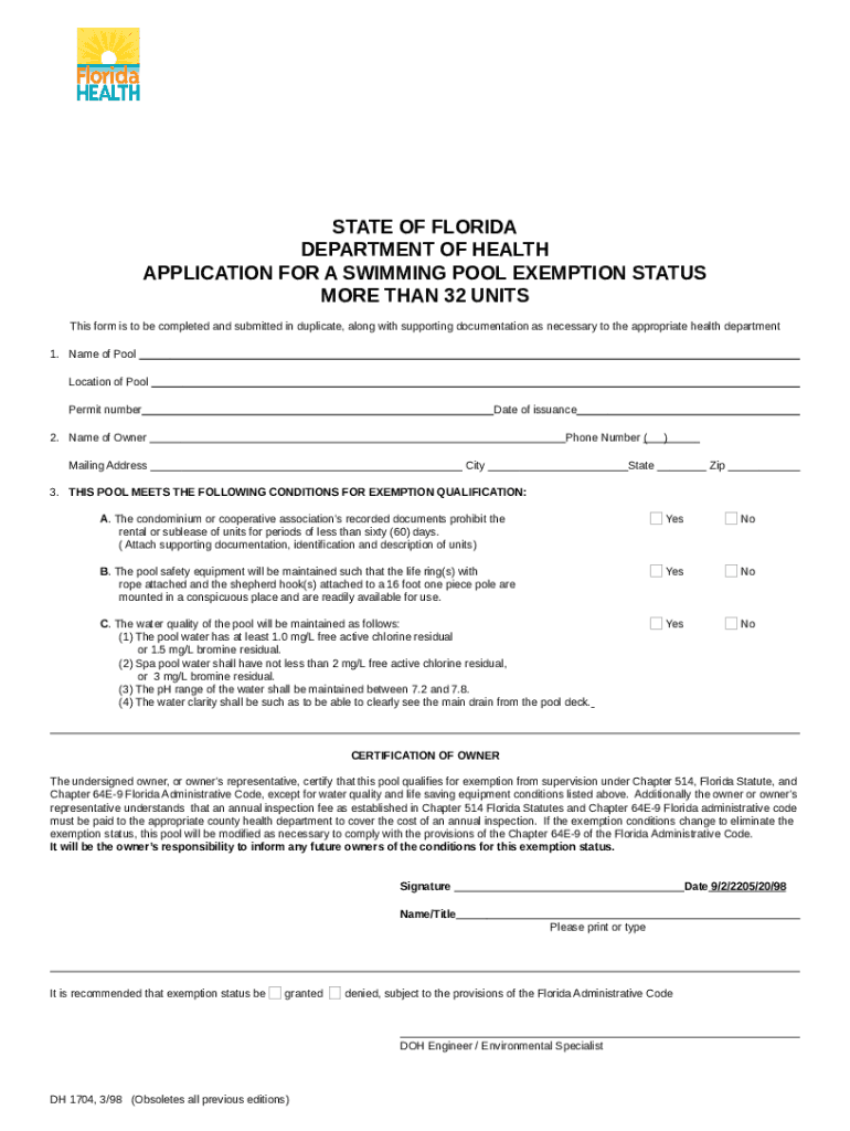 Instructions for the STATE OF FLORIDA DEPARTMENT OF HEALTH APPLICATION FOR A SWIMMING POOL ... form