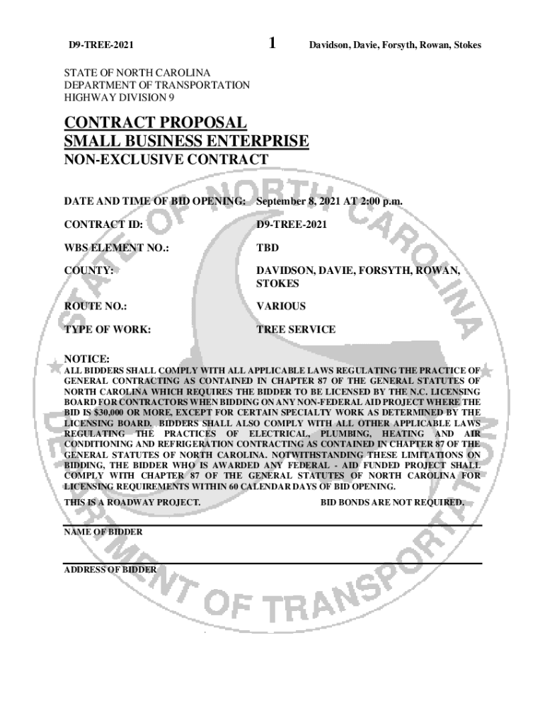 D9TREE20211Davidson, Davie, Forsyth, Rowan, StokesSTATE OF NORTH CAROLINA DEPARTMENT OF TRANSPORTATION HIGHWAY DIVISION 9CONTRACT PROPOSAL SMALL BUSINESS ENTERPRISE NONEXCLUSIVE CONTRACT DATE AND