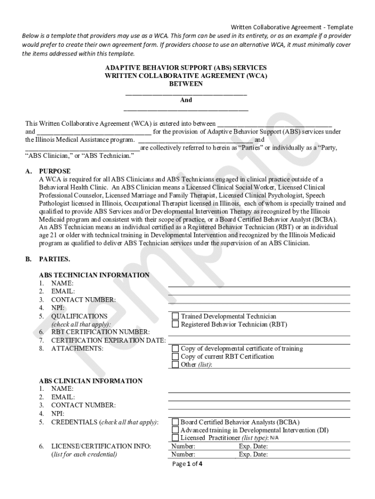 Written Collaborative Agreement Template Below is a template that providers may use as a WPA. This form can be used in its entirety, or as an example if a provider would prefer to create their own